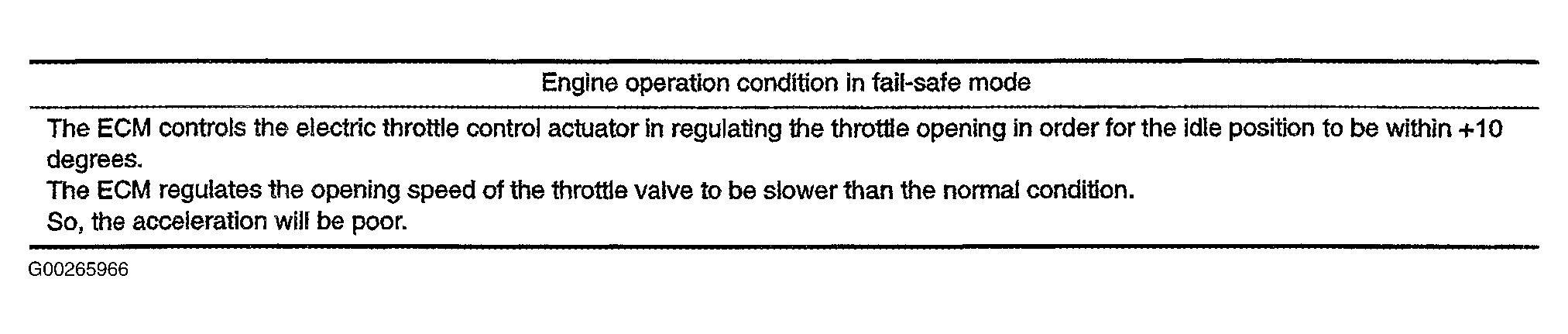 When TP sensor malfunction is detected, ECM enters fail-safe mode and the MIL illuminates. For engine operating conditions in fail-safe mode, see Fig 1.