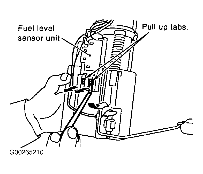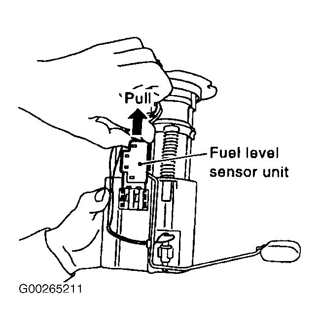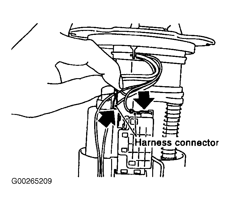 1. Remove fuel level sensor unit. See Figure. Disconnect harness connector. Hold connector by fingers and pull it out, because there is no stopper release tab. See Figure.
