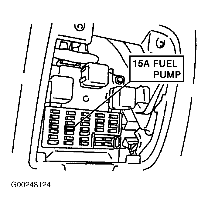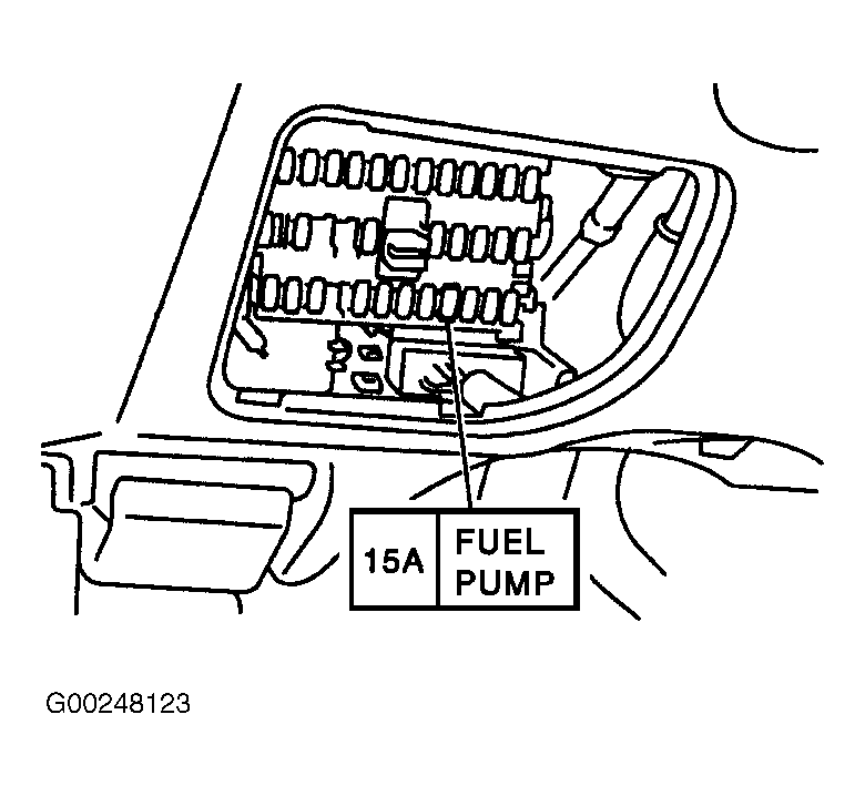 Remove fuel pump fuse. See Fig 1, Fig 2, Fig 3,Fig 4 or Fig 5 . Start engine and allow to run until engine stalls due to lack of fuel. Crank engine 2-3 more times to verify all pressure has dissipated.