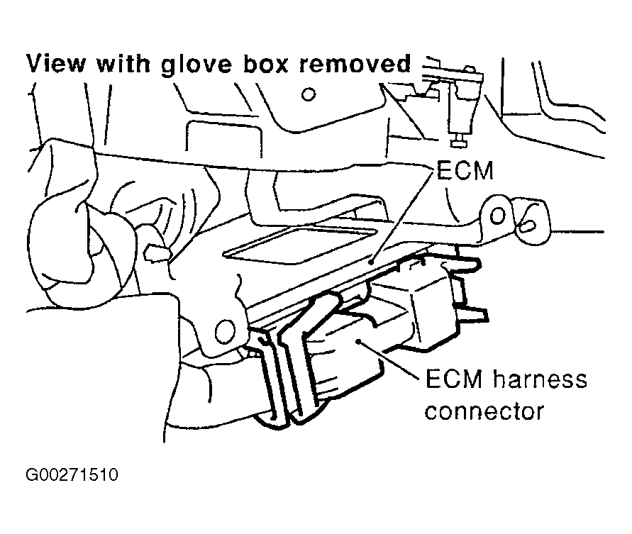 The ECM is located behind the glove box. To remove the ECM the glove box must be removed. Remove the ECM harness connector. See Fig 1 . Remove ECM. To install, reverse removal procedure.