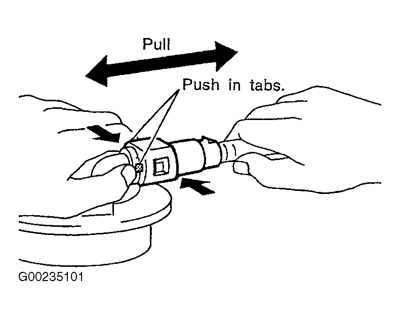 - Remove the quick connector. Put mating marks on tubes and connectors for correct installation. Hold the sides of the connector, push in the tabs and pull out the tube inserted in the retainer. See Figure .