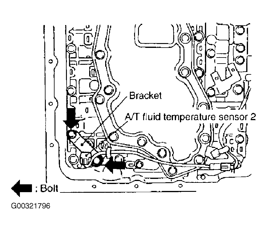 - Install transmission fluid temperature sensor No. 2 (with bracket) in control valve with TCM. Tighten to specification. See TORQUE SPECIFICATIONS . See Figure.