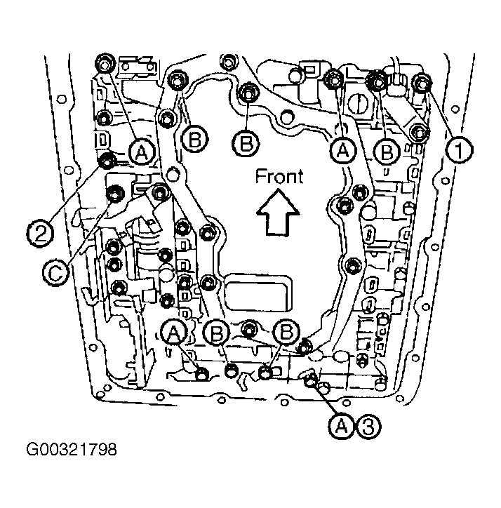 - Install bolts "A", "B", and "C" in control valve assembly. See Figure. See CONTROL VALVE BOLT IDENTIFICATION .CONTROL VALVE BOLT IDENTIFICATION