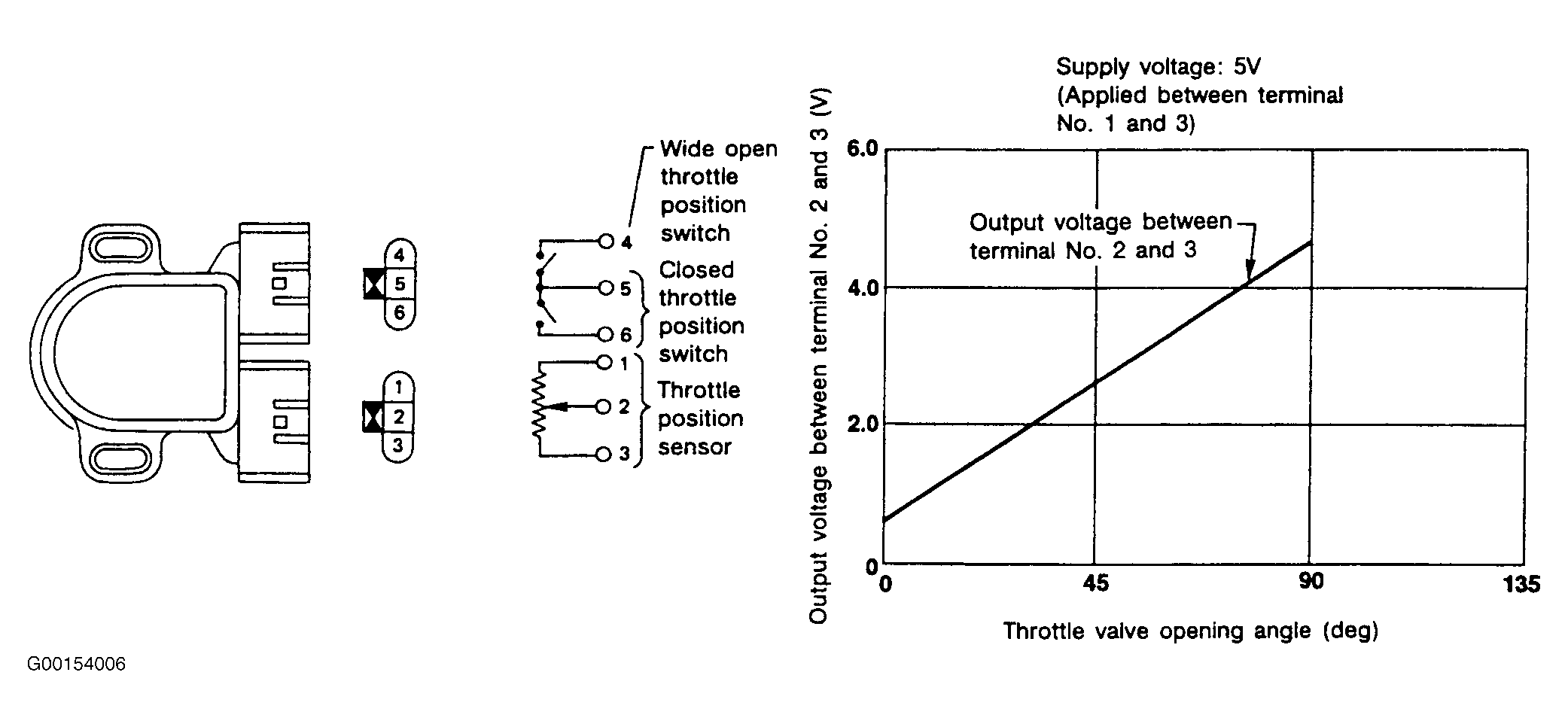 - Disconnect TPS 3-pin harness connector. Turn ignition on. Measure voltage between ground and TPS harness connector terminal No. 1. See Figure. Voltage should be 5 volts. If voltage is as specified, go to next step. If voltage is not as specified, repair open, short to ground or short to voltage in harness or connectors.