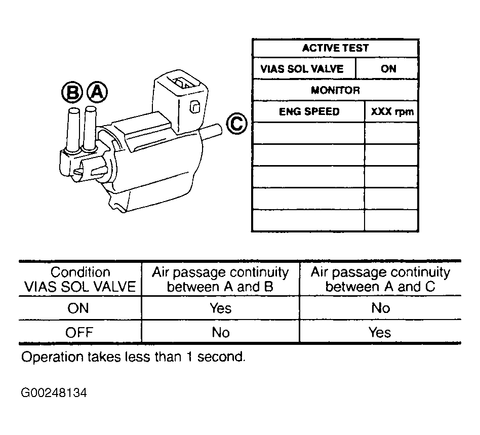 • With CONSULT-II  - Reconnect disconnected harness connector. Turn ignition switch to ON position. Perform VIAS SOL VALVE in ACTIVE TEST mode. Check air passage continuity and operation delay time under the following conditions. See Fig 2. If results are as specified, go to next step. If results are not as specified, replace VIAS control solenoid valve.