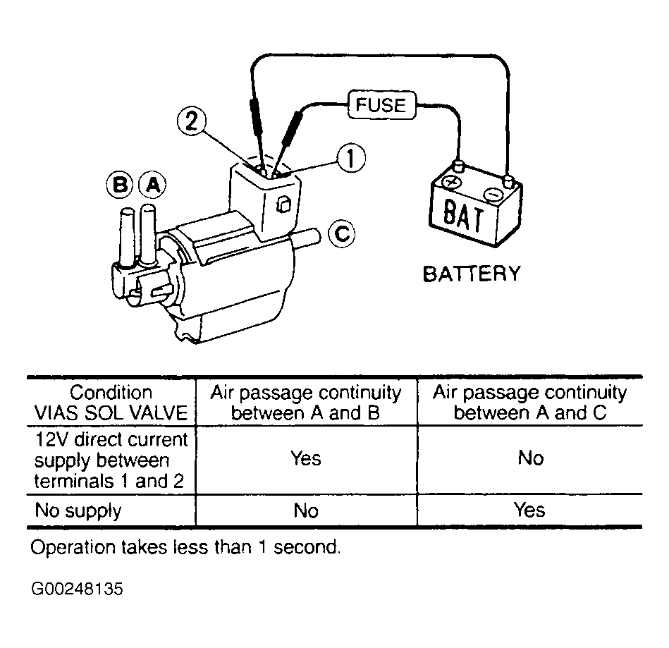 • Without CONSULT-II  - Check air passage continuity and operation delay time under the specified conditions. See Fig 3. If results are as specified, go to next step. If results are not as specified, replace VIAS control solenoid valve.