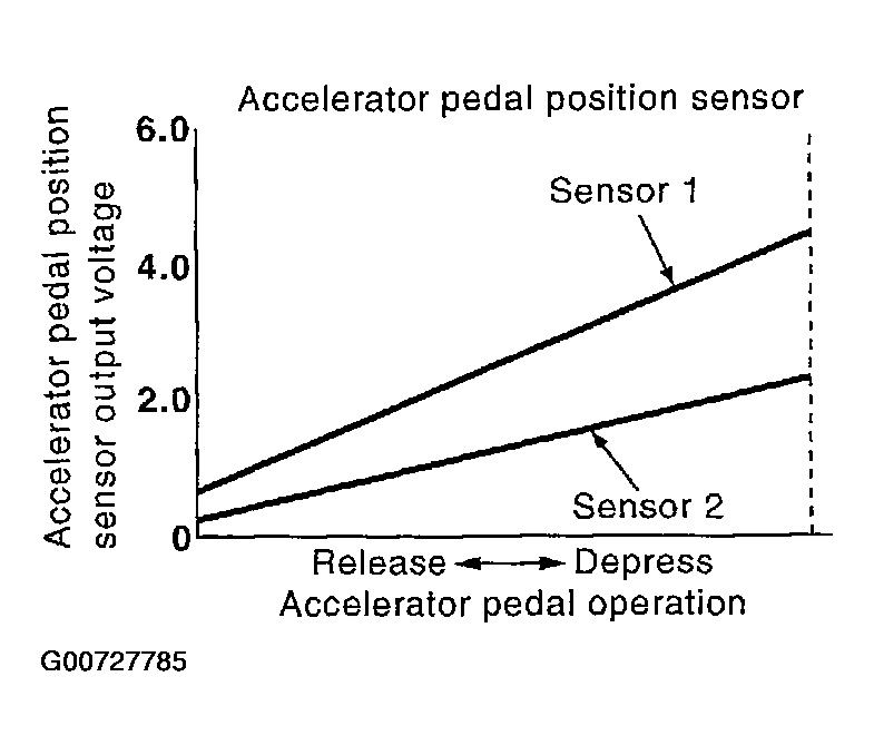 Accelerator pedal position sensor has two sensors. See Figure. These sensors are a kind of potentiometers which transform the accelerator pedal position into output voltage, and emit the voltage signal to the ECM. In addition, these sensors detect the opening and closing speed of the accelerator pedal and feed the voltage signals to the ECM. The ECM judges the current opening angle of the accelerator pedal from these signals and controls the throttle control motor based on these signals.