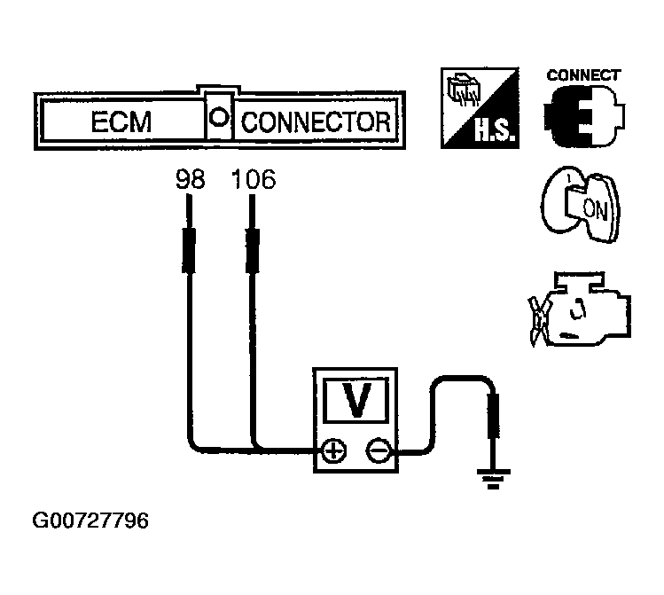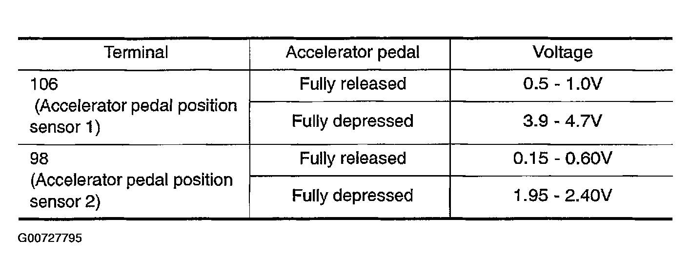 3. Check voltage between ECM terminals 106 (APP sensor 1 signal), 98 (APP sensor 2 signal) and engine ground under the following conditions. See Figure and Figure.