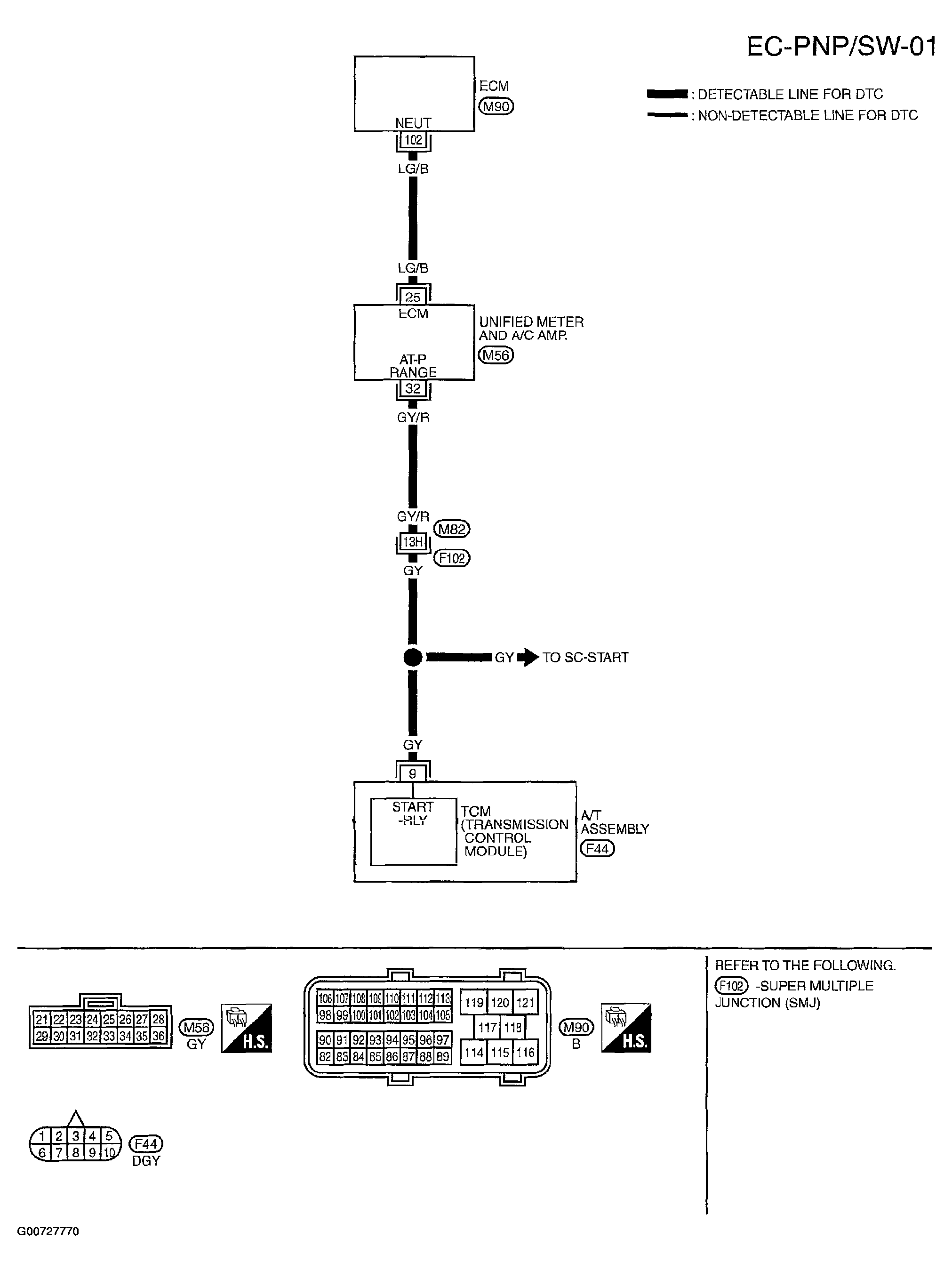 - Check harness continuity between TCM terminal 9 and unified meter and A/C amp. terminal 32.