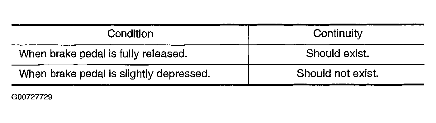 - Check continuity between ICC brake switch terminals 1 and 2 under the following conditions. See Figure and Figure.