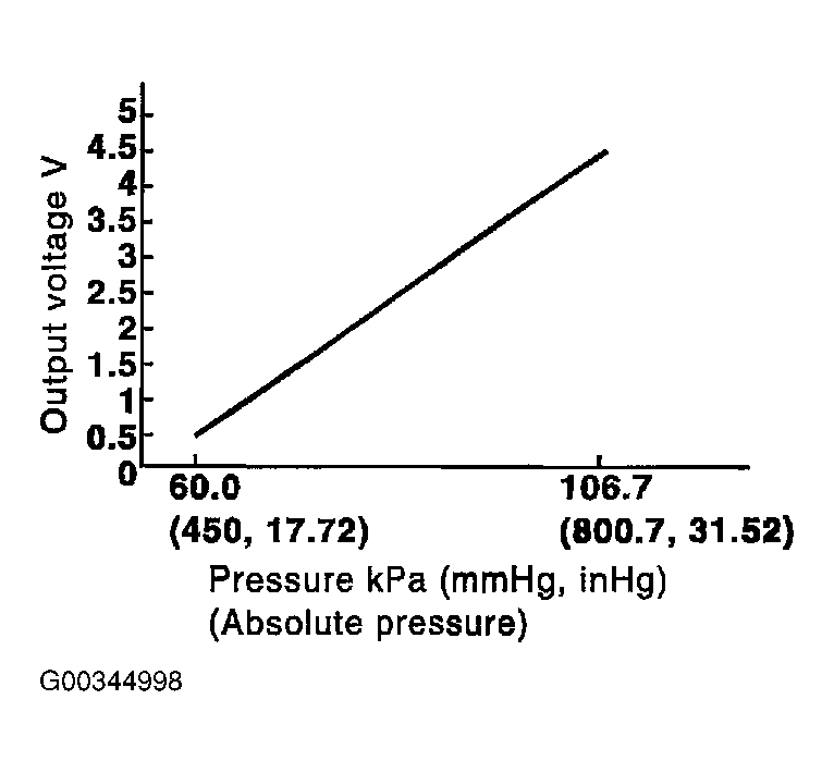 The EVAP control system pressure sensor detects pressure in the purge line. The sensor output voltage to the ECM increases as pressure increases.
