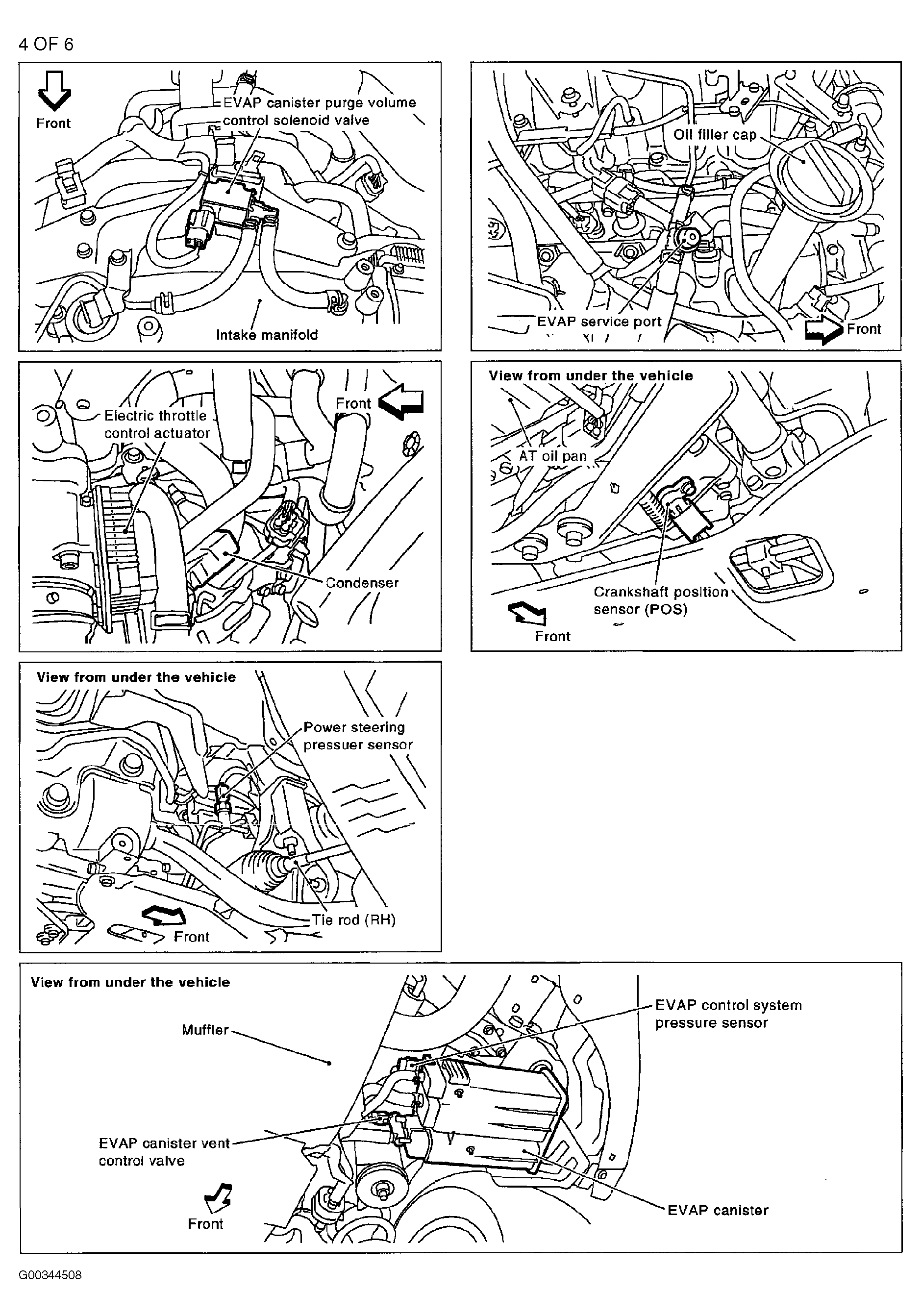 5. Using EVAP leak detector, locate the EVAP leak. For the leak detector, refer to the instruction manual for more details. Refer to EVAPORATIVE EMISSION LINE DRAWING  .