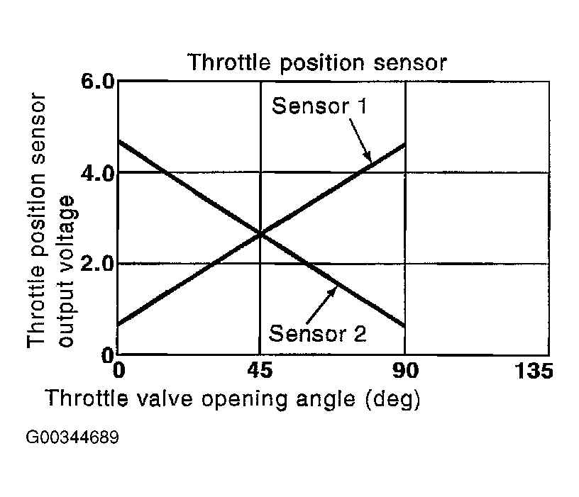 The throttle position sensor has the two sensors. These sensors are a kind of potentiometers which transform the throttle valve position into output voltage, and emit the voltage signal to the ECM. In addition, these sensors detect the opening and closing speed of the throttle valve and feed the voltage signals to the ECM. The ECM judges the current opening angle of the throttle valve from these signals and the ECM controls the throttle control motor to make the throttle valve opening angle properly in response to driving condition. See Figure .
