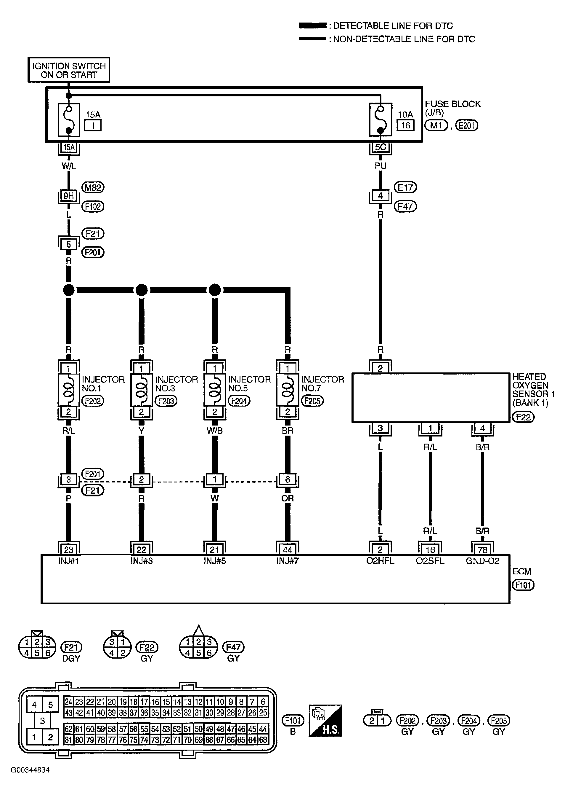 4. Check harness continuity between ECM terminal and HO2S1 terminal as follows. See Fig 1 .