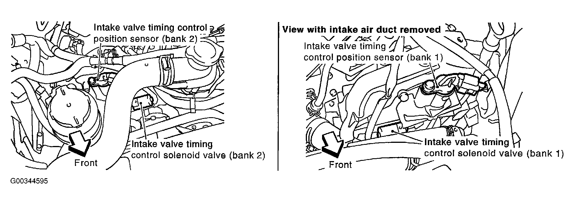 Intake valve timing control position sensors are located in the front of cylinder heads in both bank 1 and bank 2. See Figure . For a view of Intake valve timing control position sensor, see Figure .