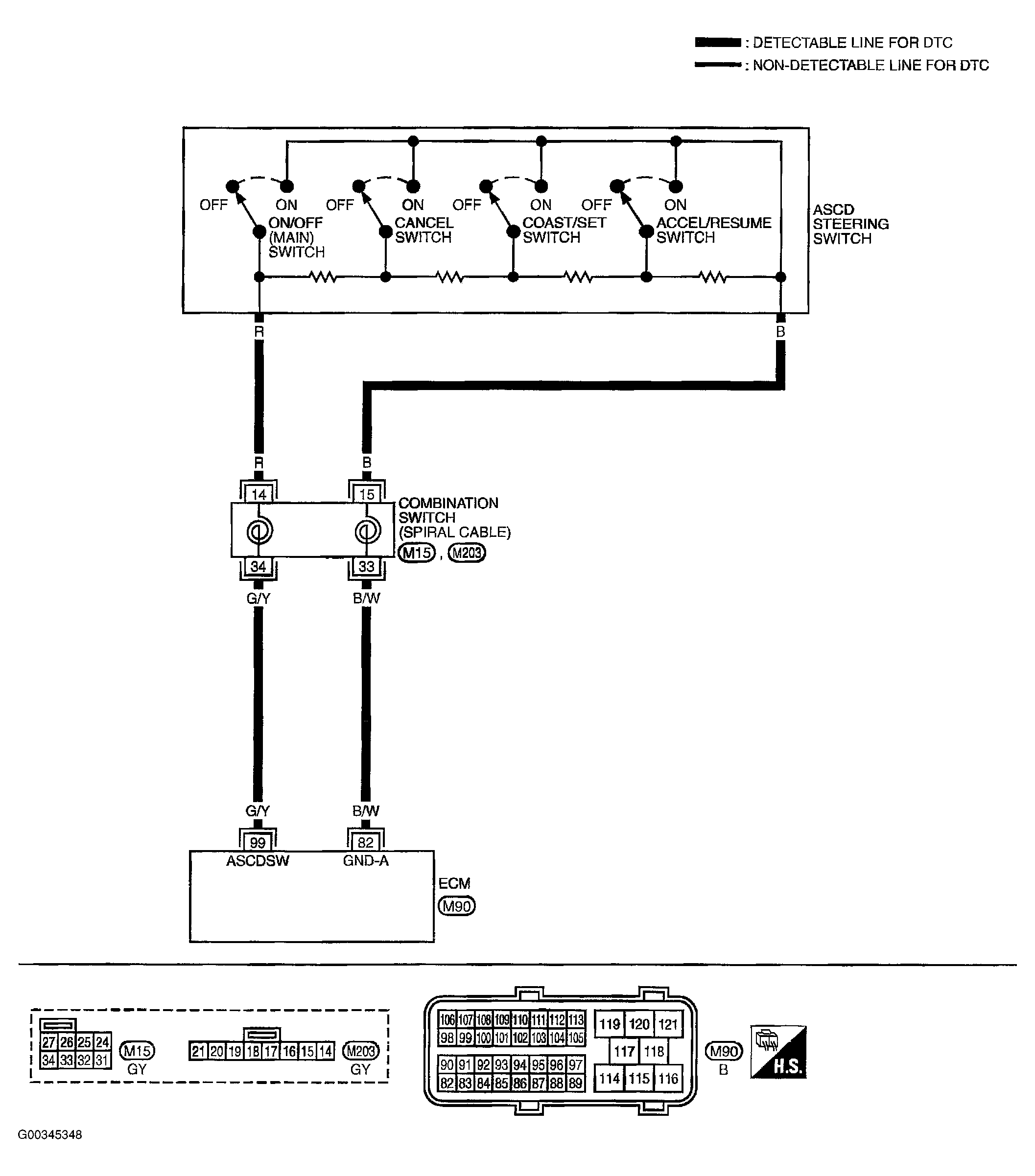 1. Check harness continuity between ECM terminal 99 and combination switch terminal 14.