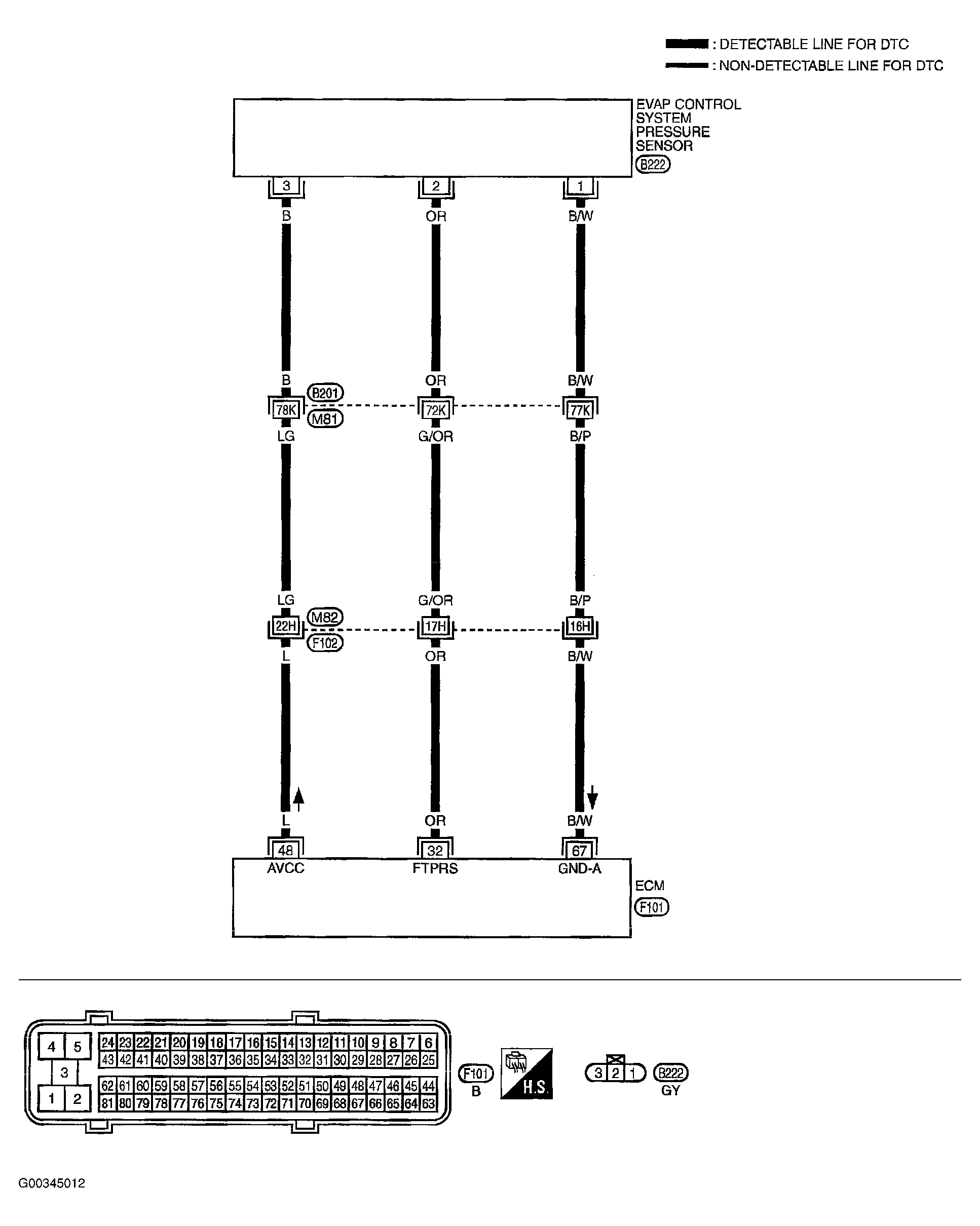 3. Check harness continuity between EVAP control system pressure sensor terminal 1 and ECM terminal 67.