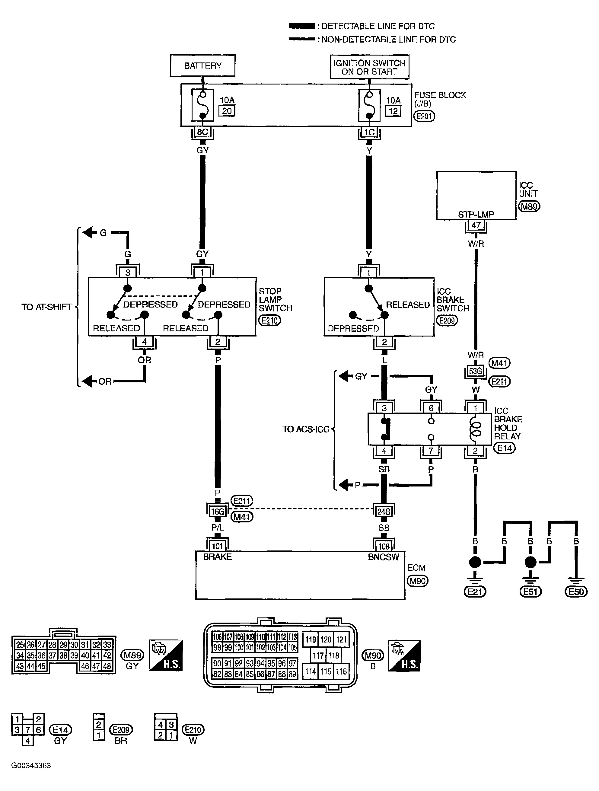 - Check harness continuity between ICC brake hold relay terminal 4 and ECM terminal 108. Refer Wiring Diagram.