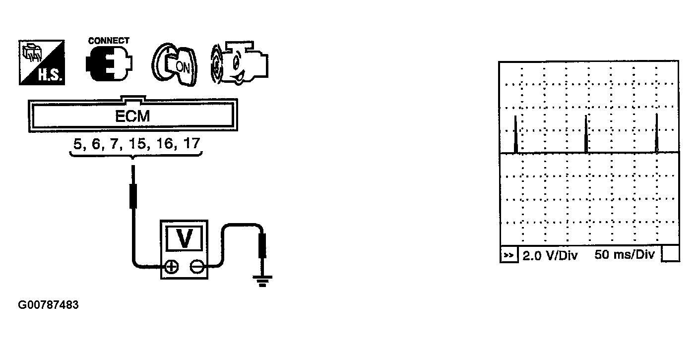 2. Read the voltage signal between ECM terminals 5, 6, 7, 15, 16, 17 and ground with oscilloscope.