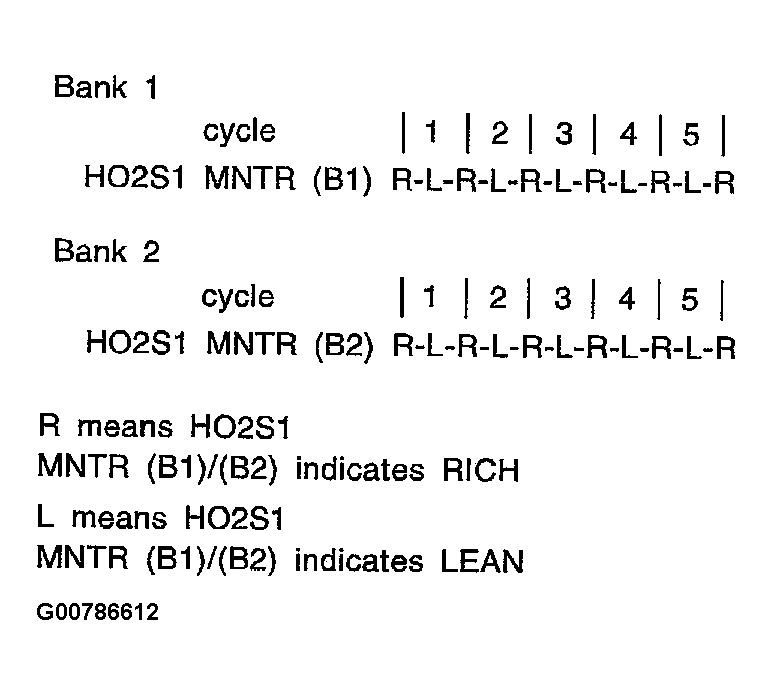 - HO2S1 MNTR (B1)/(B2) in DATA MONITOR mode changes from RICH to LEAN to RICH more than 5 times in 10 seconds.