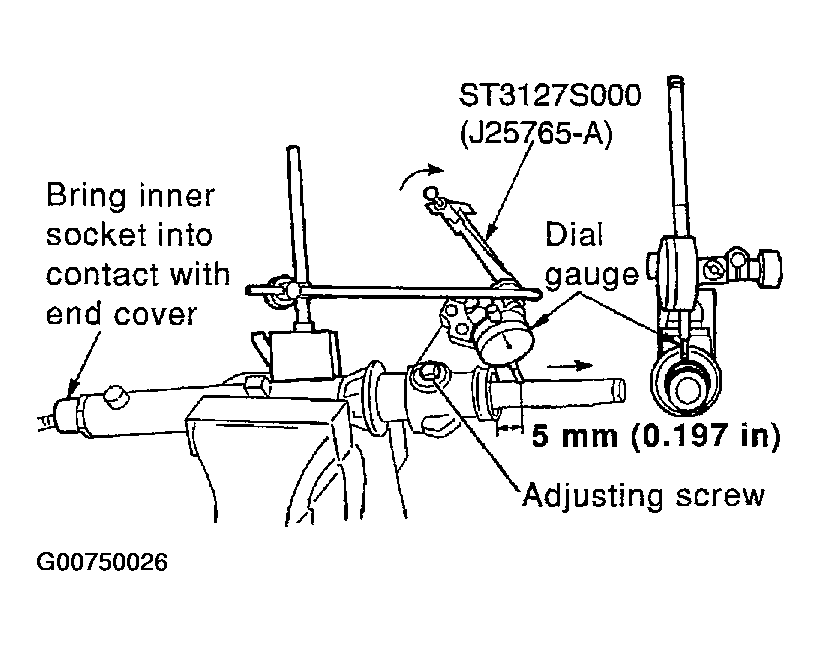 - Measure pinion rotation torque with preload gauge (special service tool), then confirm whether its reading is within specified range. If reading is not within specified range, readjust screw angle with adjusting screw. Replace gear assembly with new one, if reading is still not within specified range or rotation torque of adjusting screw is less than 5 N.m (0.51 kg-m, 44 in-lb).