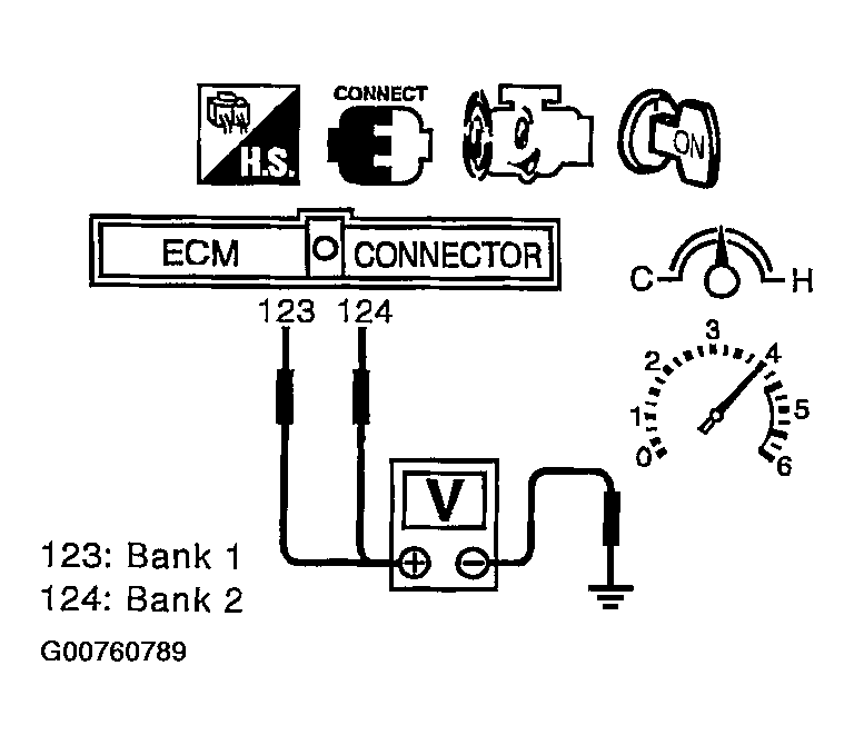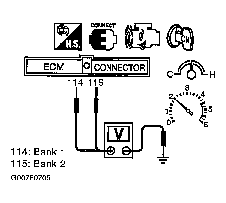 5. Set voltmeters probes between ECM terminals 114 [HO2S1 (bank 1) signal], 115 [HO2S1 (bank 2) signal] and ground, and ECM terminals 123 [HO2S2 (bank 1) signal], 124 [HO2S2 (bank 2) signal] and ground. See Figure and Figure .