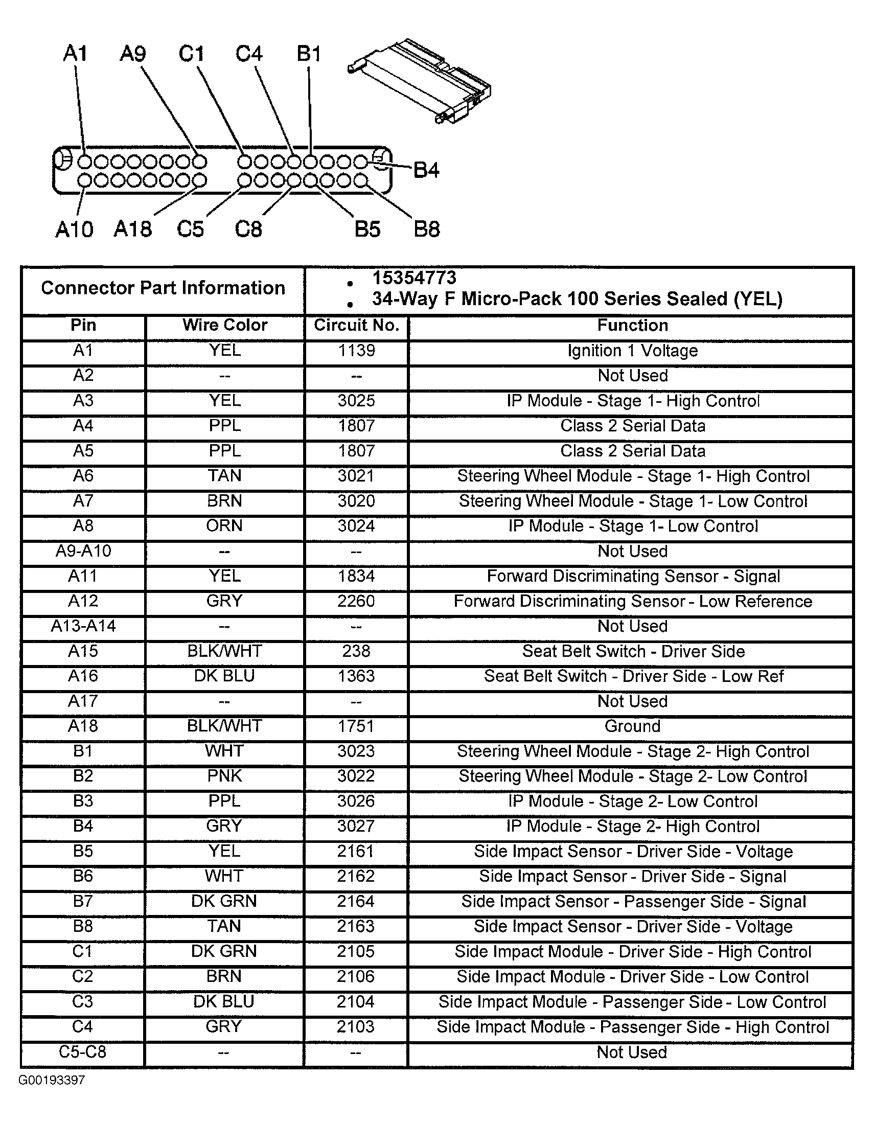 15. Inspect Purple wire between DIM connector C2 terminal A11 and SDM connector terminal A4. See Figure and Figure . If problem exists, repair as necessary and go to step  17. If problem does not exist, inspect DIM harness connector C2 for poor connections and terminal tension. If no problem is found with connector, replace DIM. See DASH INTEGRATION MODULE  under REMOVAL & INSTALLATION.