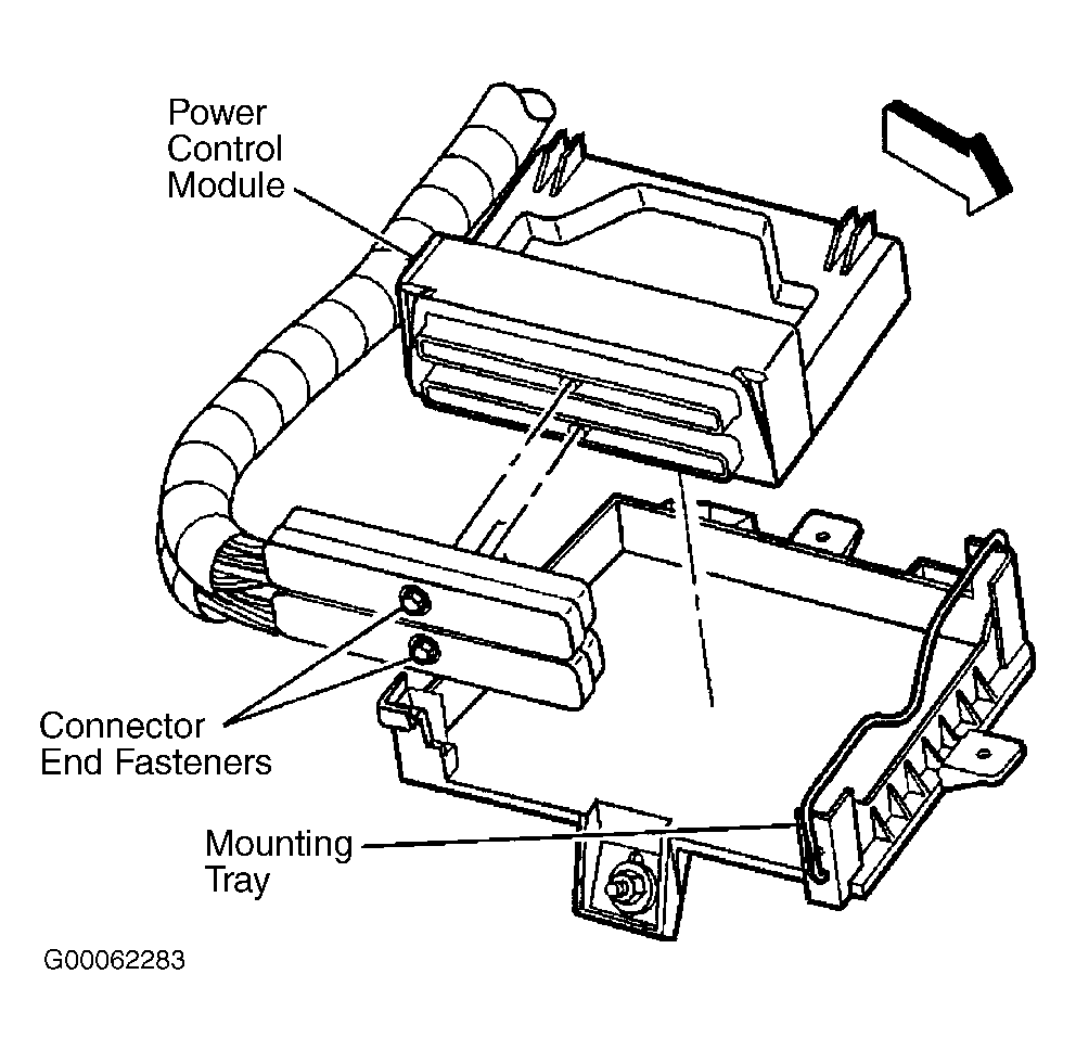 Ensure ignition switch is in OFF position. Remove air cleaner assembly. Disconnect PCM harness connectors. Release spring latch from PCM. Lift PCM from mounting tray. See Fig 1 . Remove PCM from engine compartment. To install, reverse removal procedure. Tighten PCM connector end fasteners to 71 INCH lbs. (8 N.m). Program as necessary. See PROGRAMMING .