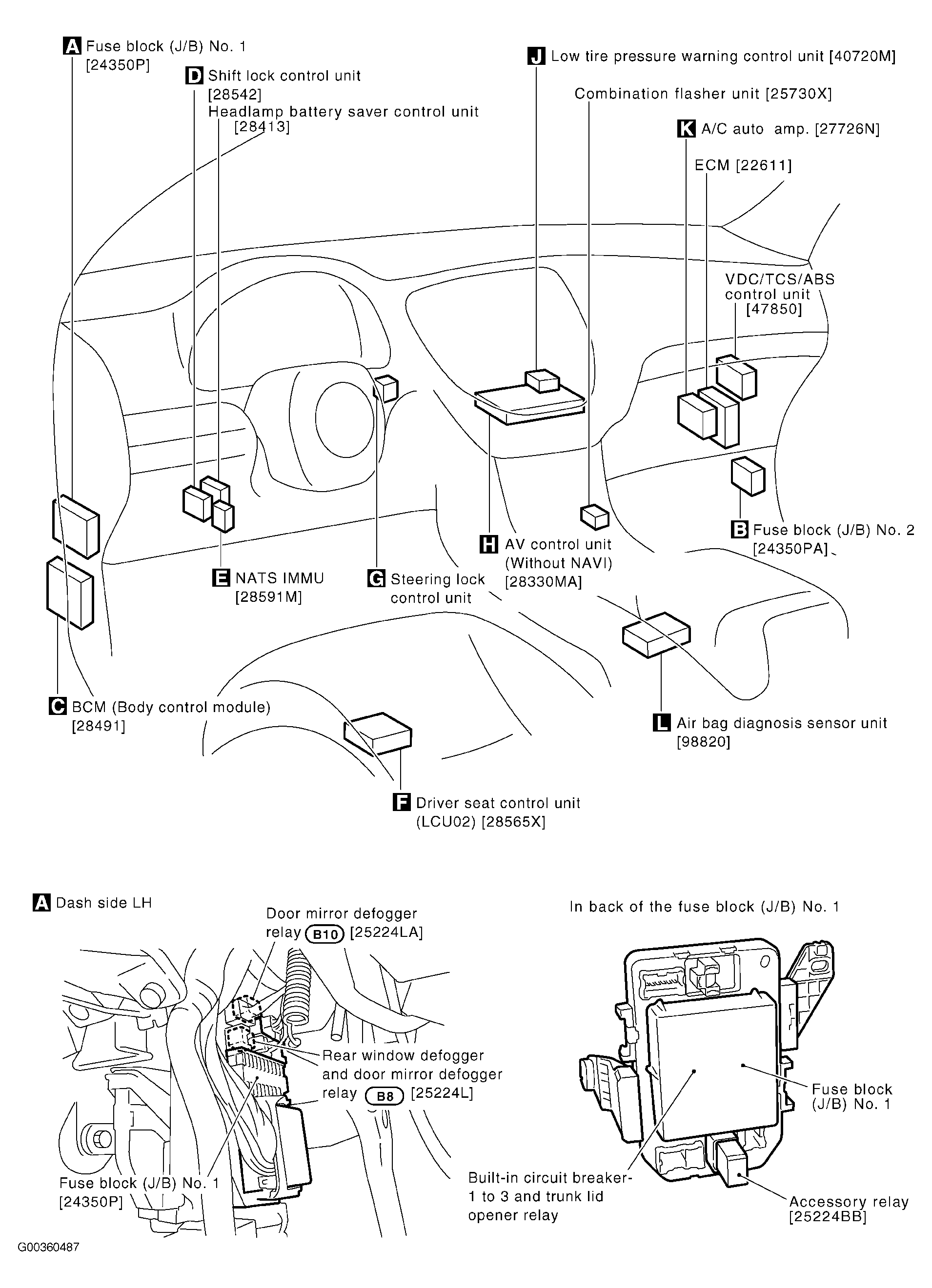| Trunk Lid Opener Relay | On back of fuse block (J/B) No.1. See Figure . |