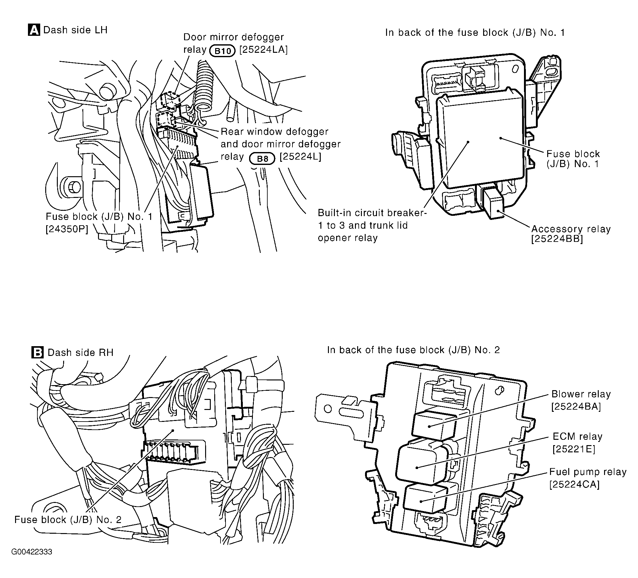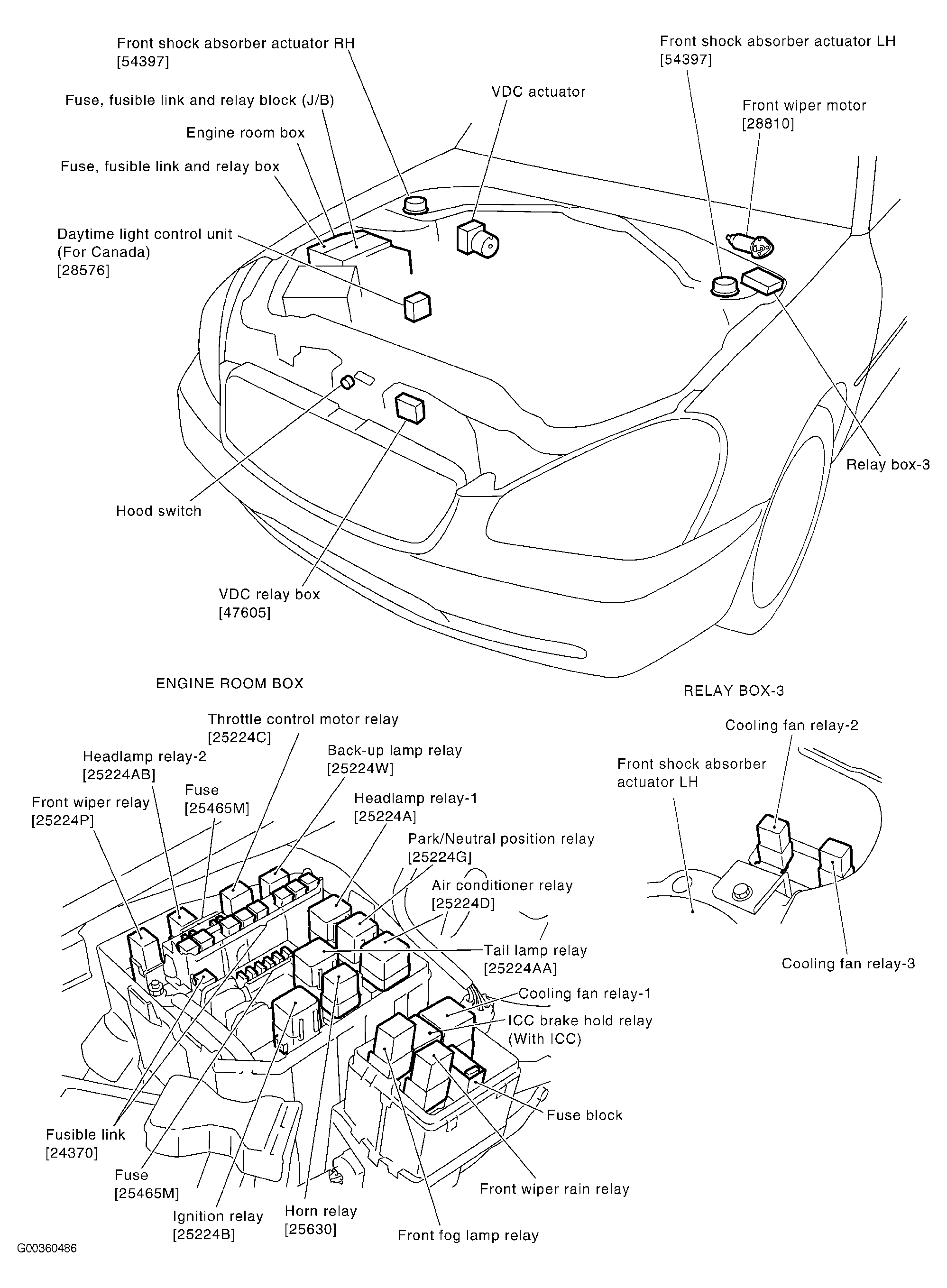 | Fuse, Fusible Link & Relay Block (J/B) | In engine room box. See Figure . |