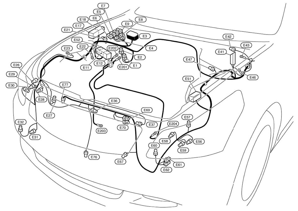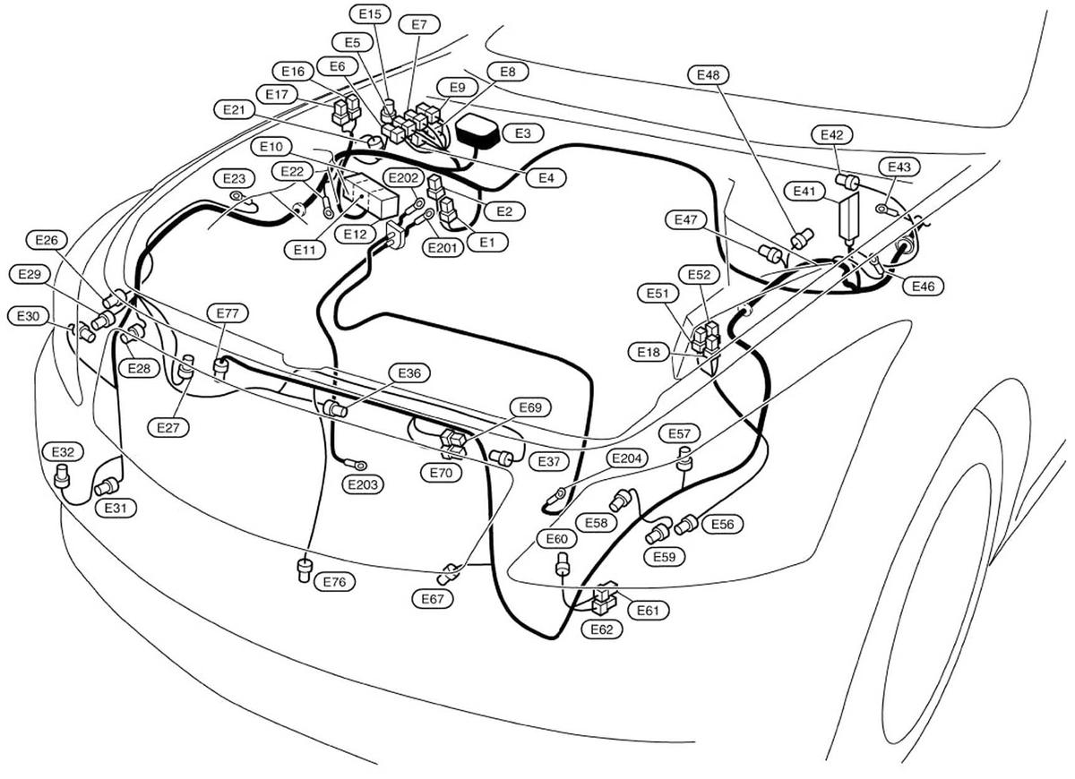 | Relay Box (Sedan) (E12) | Right rear of engine compartment. See Figure. |