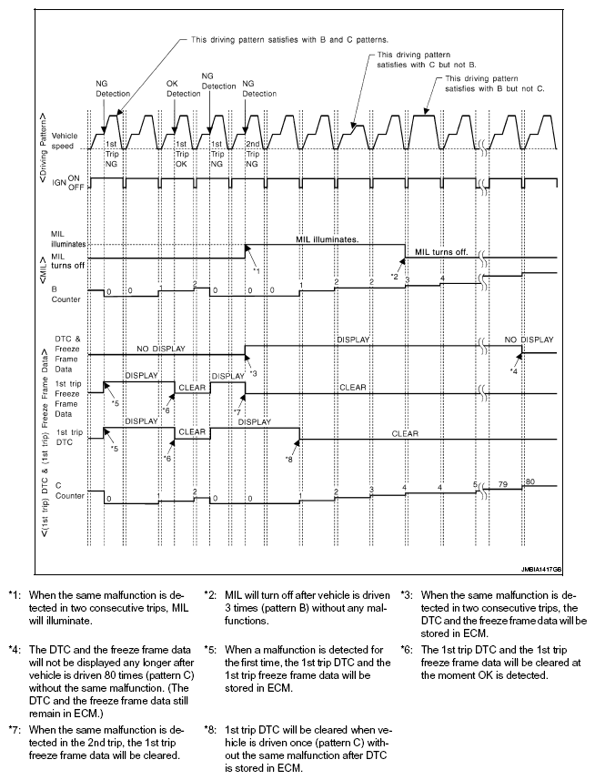 - The MIL will turn off when the B counter reaches 3 (*2 in OBD SYSTEM OPERATION CHART).