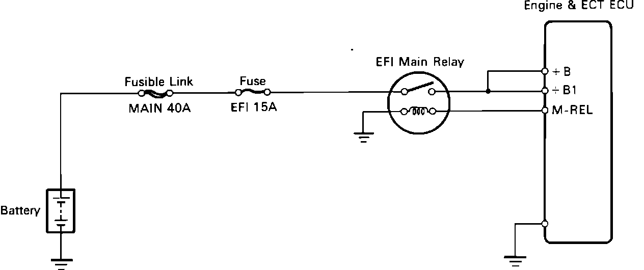 When the ignition switch is turned to the ON position, the relay coil is energized. When powered the relay contacts close, sending battery voltage to ECU terminals +B and +B1.