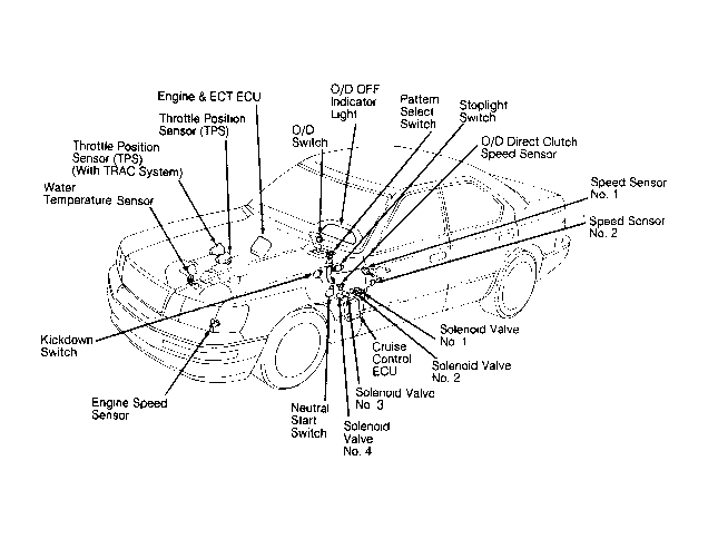 - If no transmission trouble codes are present, the light will blink continuously 2 times per second. Trouble code flashes will be at the rate of one flash per second with longer pauses separating digits and codes. Refer to LS400 AUTOMATIC TRANSMISSION CODE IDENTIFICATION table. Refer to appropriate transmission diagnostic chart. For location of transmission components, see Figure.