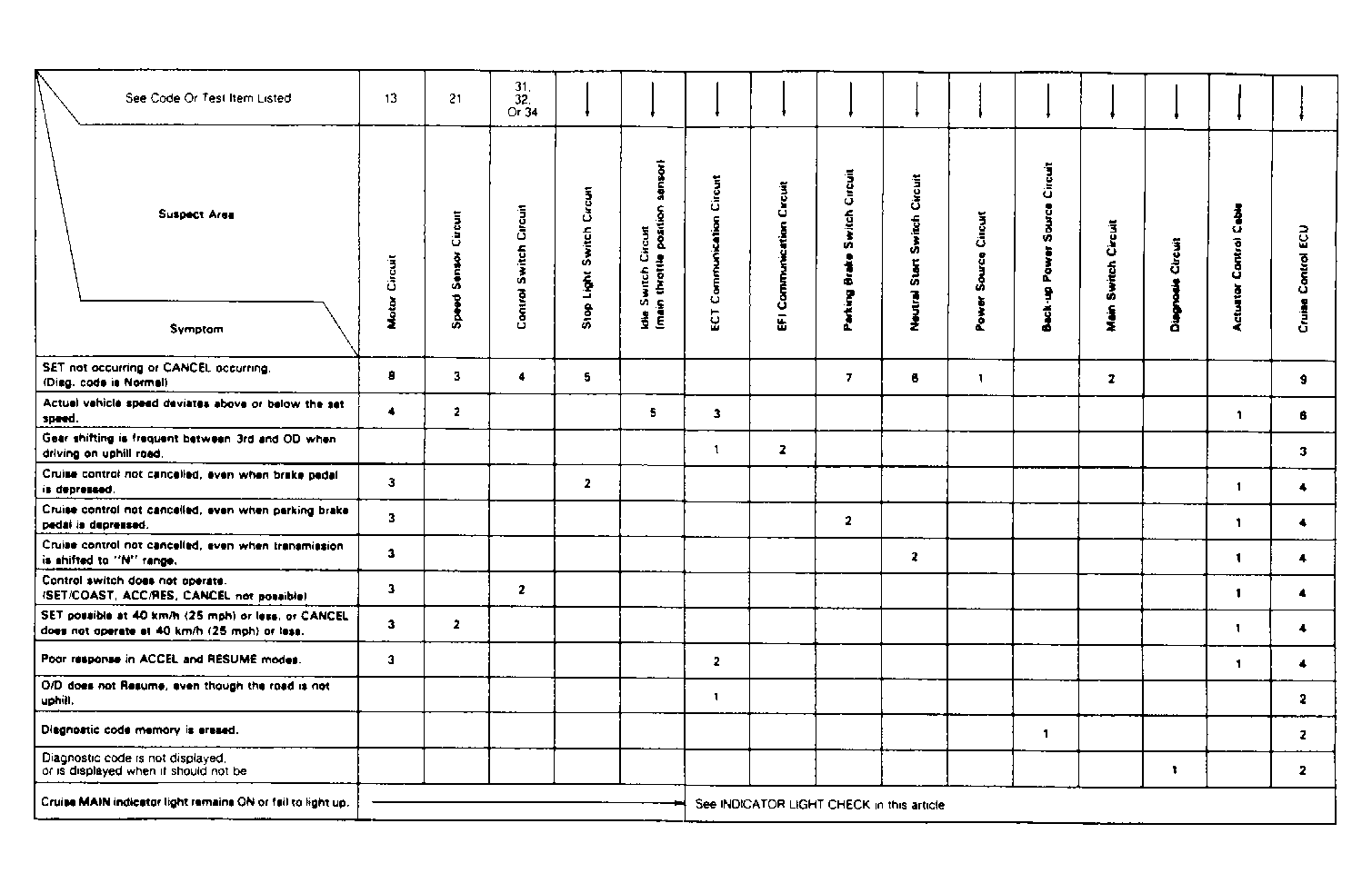 Perform INPUT SIGNAL CHECK under TROUBLE SHOOTING in this article. Cruise control indicator light should generate a 6-pulse signal when brake pedal is depressed. If pulse signal occurs as indicated, go to next inspection item shown on matrix chart in Figure or Figure . If pulse signals do not occur as indicated, go to WIRING HARNESS.