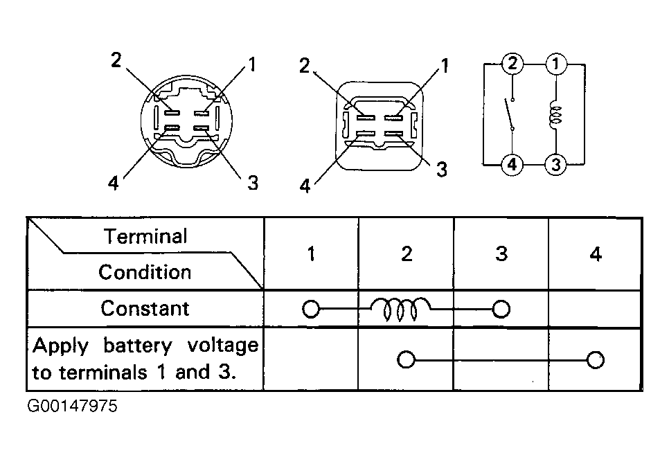 Inspect relay continuity between terminals. See Fig 1. If continuity is not as specified, replace the relay.