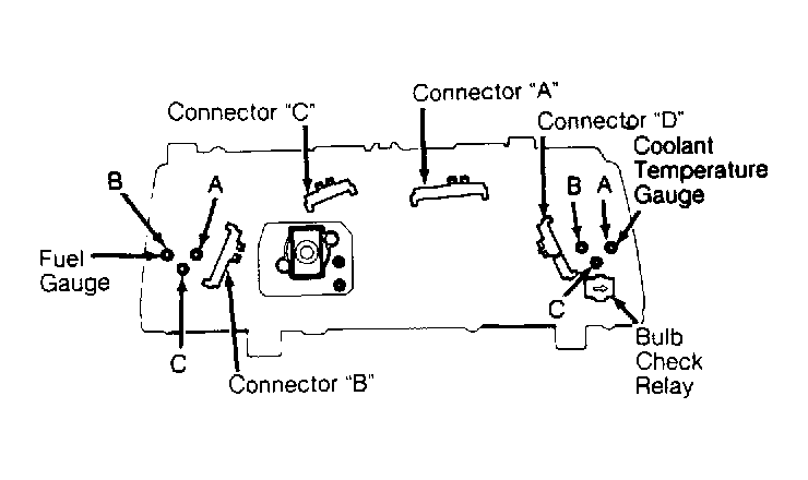 Connect negative battery terminal to terminal "B" of bulb check relay located on rear of instrument panel. See Figure. Connect positive battery terminal through a 1.4-watt test bulb to terminal "C". Touch positive lead to terminal "A". If test bulb does not light, replace bulb check relay.