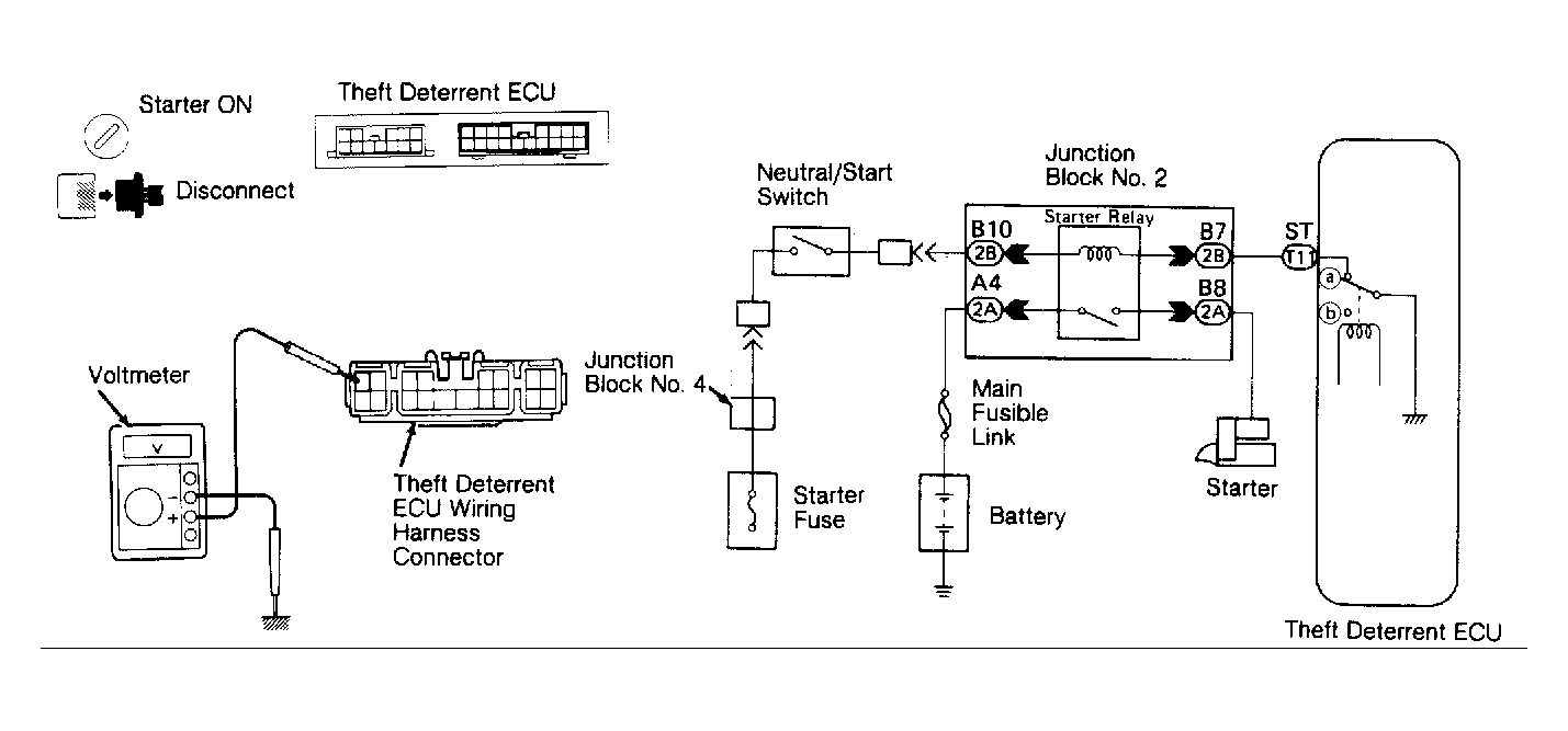5. Disconnect theft deterrent ECU connectors. See Fig 2. Turn ignition switch to ST (start) position. With transmission in Neutral, check voltage between ST terminal of theft deterrent ECU wiring harness connector and body ground.
