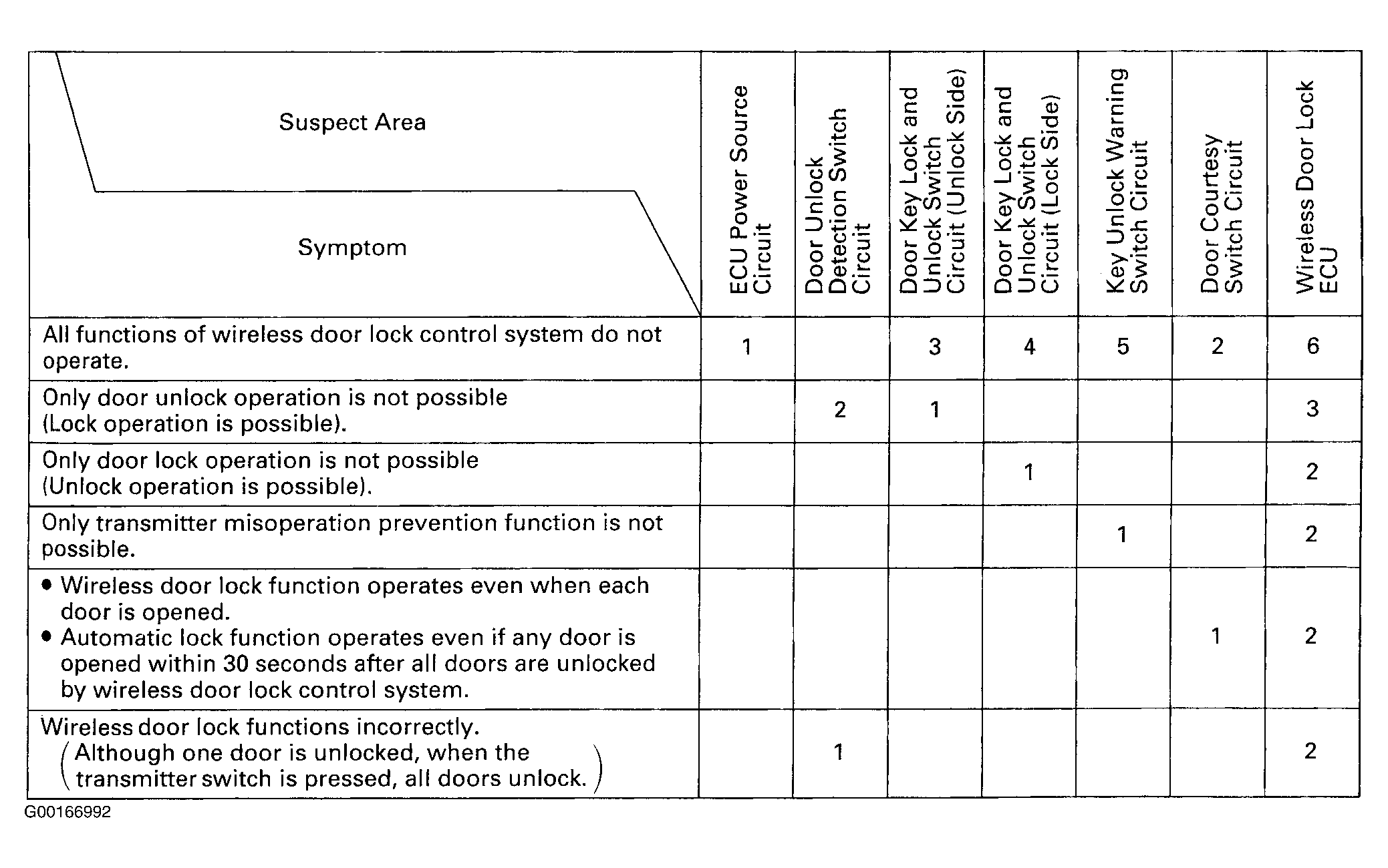 Trouble shooting the wireless door lock control system is based on the premise that the door lock control system is working normally. Accordingly, before trouble shooting the wireless door lock control system, first make certain that the door lock control system is working normally.