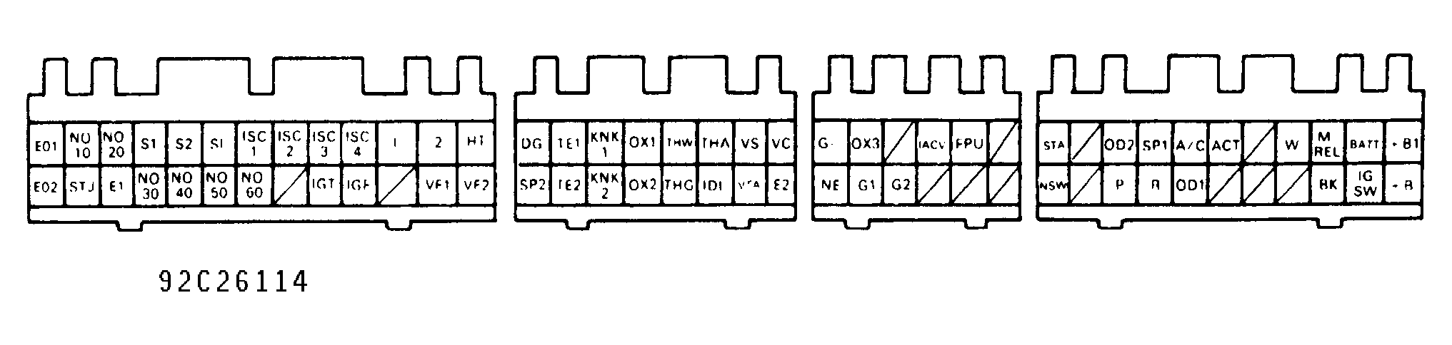 2. Using an ohmmeter, check for continuity to ground on ECU terminals ISC1, ISC2, E1, E01 and E02. See Figure. Resistance should be zero ohms. If resistance is not zero ohms, repair open to ground.