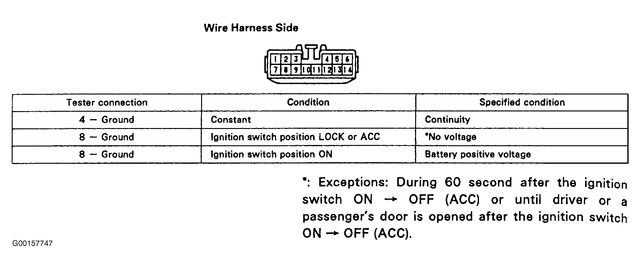 Disconnect the connector from the power window master switch and inspect the connector on the wire harness side. See Fig 1. If the circuit is not as specified, inspect the circuit connected to other parts. See WIRING DIAGRAMS .