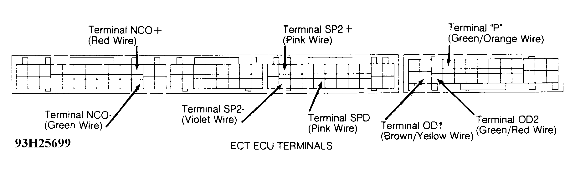 - Access ECT ECU located on right side of dash, under glove box. Turn ignition on. Using a DVOM, backprobe between ECT ECU connector terminal "P" (Green/Orange wire) and ground with connector connected. See Figure.