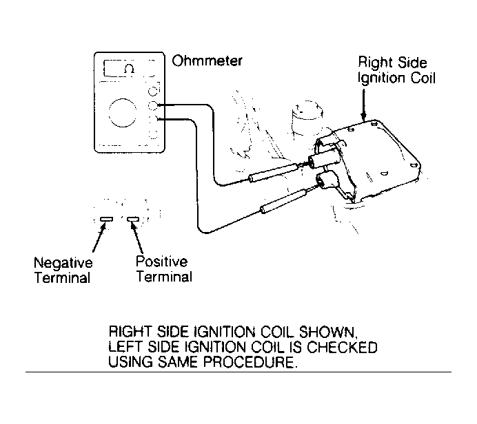 Turn ignition off. Disconnect wires from ignition coil. Using an ohmmeter, check primary coil resistance on ignition coil. See Fig 1. For resistance specifications, see IGNITION COIL RESISTANCE  table.