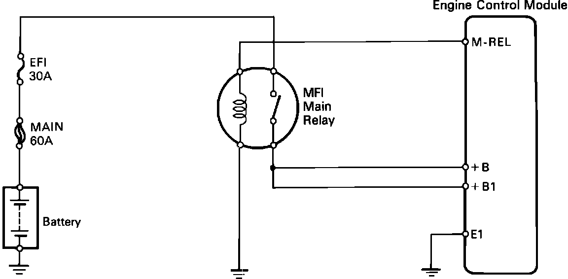 When the ignition switch is turned to the ON position, the ECM powers the relay coil through terminal M-REL. When powered the relay contacts close, sending battery voltage to ECM terminals +B and +B1.