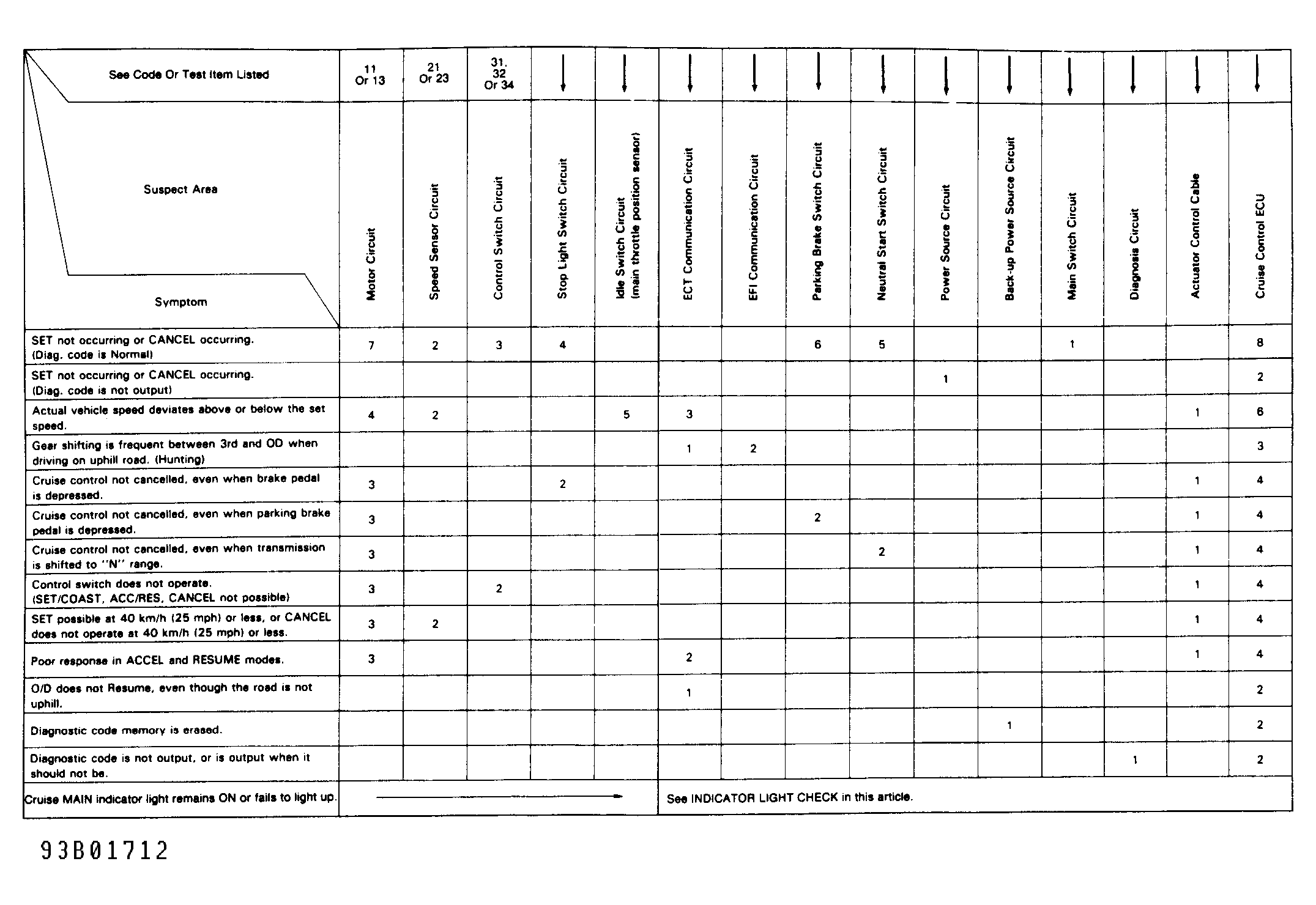 Perform diagnostic code check to determine if problem is in sensors or wiring harness. If the normal code is displayed, proceed to MATRIX CHART OF PROBLEM SYMPTOMS. See Figure or Figure . If a malfunction code is present (diagnostic code confirmed), perform procedure indicated by the diagnostic codes chart. See Figure. See TESTING. If the instructions "go to next inspection item shown on matrix chart" are given in TESTING procedure(s), inspect the next highest numbered item listed. If the trouble still occurs even though there are no abnormalities in any of the circuits, then check or replace the cruise control ECU as the last step.