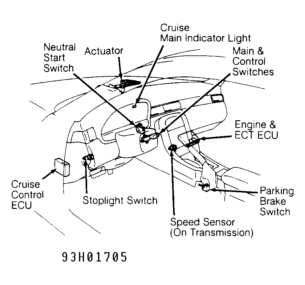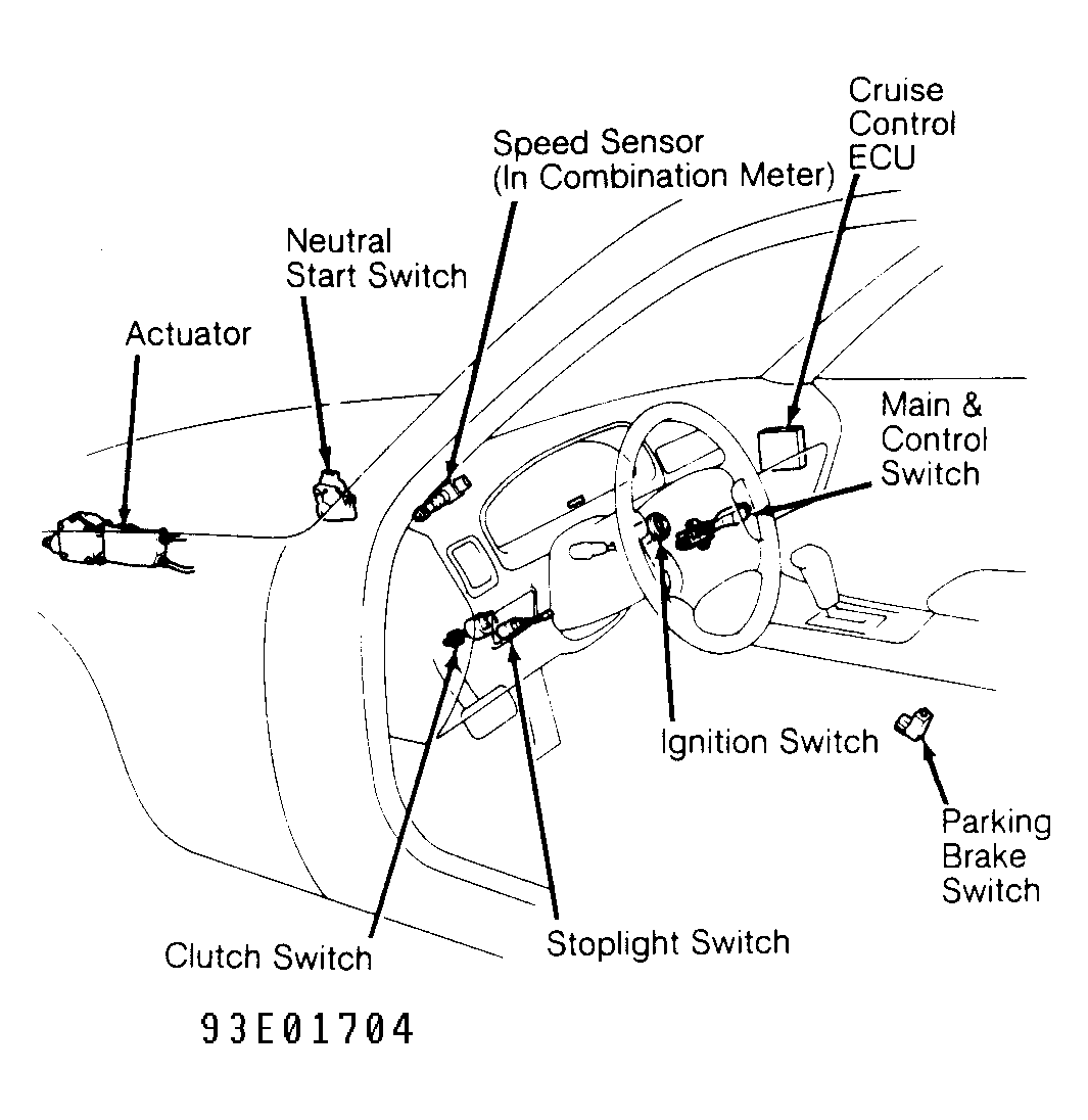 Cruise control system consists of cruise control Electronic Control Unit (ECU), actuator and associated cables, speed sensor(s), parking brake switch, cruise control switch, stoplight switch, clutch switch(M/T) and related wiring. See Fig 1, Fig 2 or Fig 3 . The system allows vehicle to cruise at a desired speed more than 25 MPH (40 Km/h).