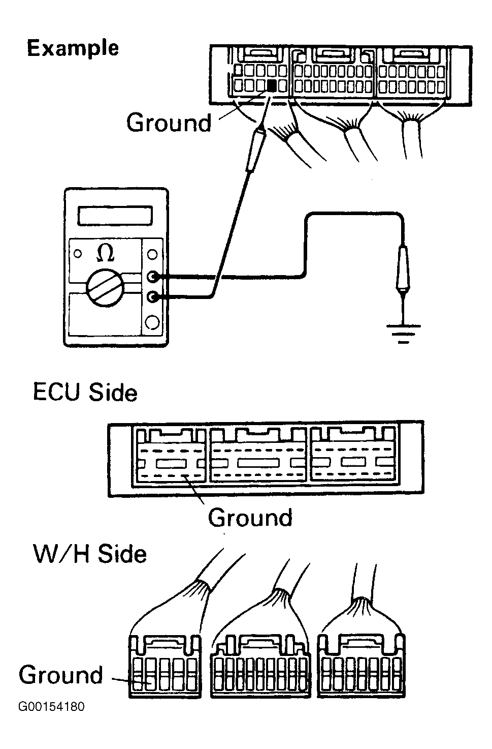 First check the ECU ground circuit. If it is faulty, repair it. If it is normal, the ECU could be faulty, so replace the ECU and check if the symptoms appear. Measure the resistance between the ECU ground terminal and the body ground. Resistance: 1Ω or less. Disconnect the ECU connector, check the ground terminals on the ECU side and the wire harness side for bend and check the contact pressure. See Fig 1.