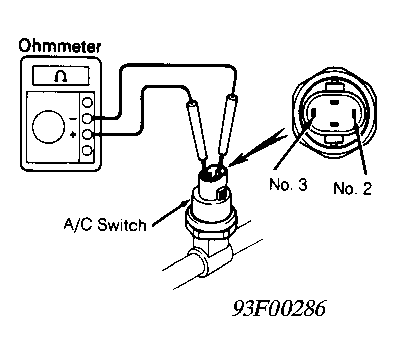 - Disconnect A/C switch. Install A/C manifold gauge set. Attach ohmmeter test leads to terminals No. 2 and 3. See Fig 1. Continuity should be present when system pressure is less than 178 psi (1226 kPa).