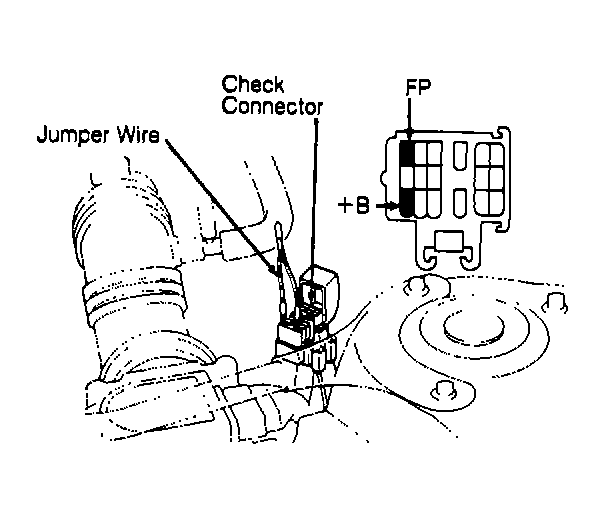 4. Place injector into a container to catch fuel spray. Turn ignition on. DO NOT start engine. Using a jumper wire, connect terminals FP and +B of check connector. See Fig 1.