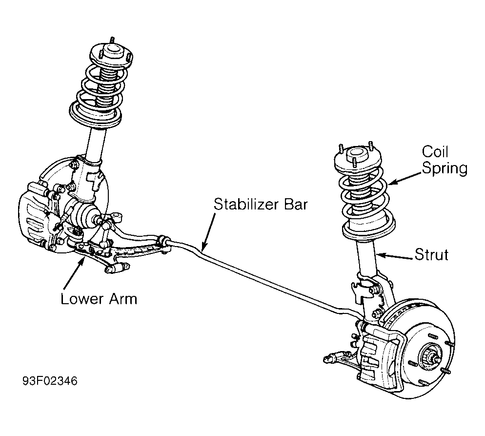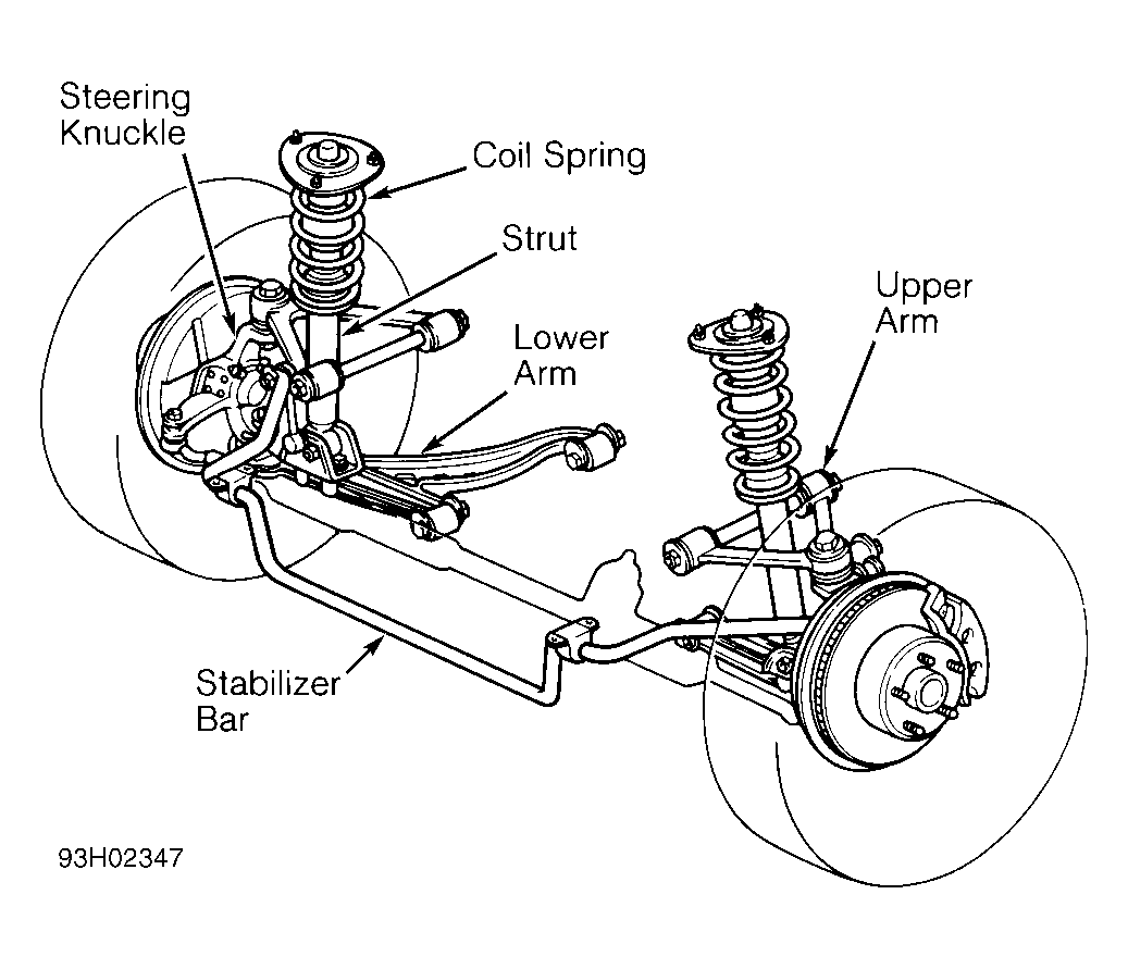 ES300 suspension combines MacPherson struts with "L" shape lower arms. See Fig 1. LS400 suspension includes upper wishbones, lower arms, struts, shock absorbers, and coil springs. See Fig 2. All models include stabilizer bars. SC300 and SC400 suspension includes double wishbones, coil springs, and struts. See Fig 3.